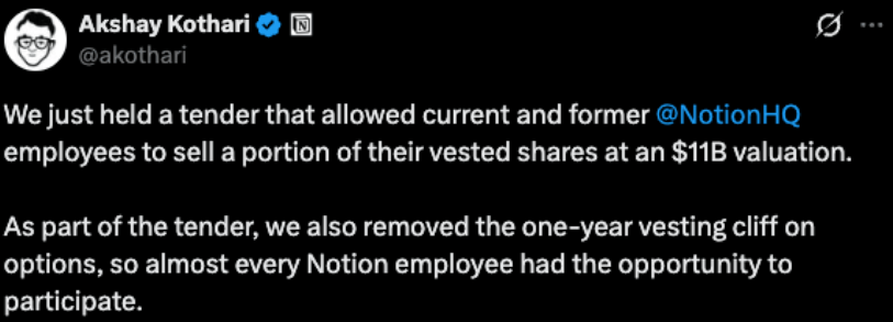 Notion’s recent decision to remove the one-year vesting cliff signals something important about where this may be heading: as AI compresses time-to-value for new hires, the case for broad employee participation gets stronger. Props to Akshay and team!