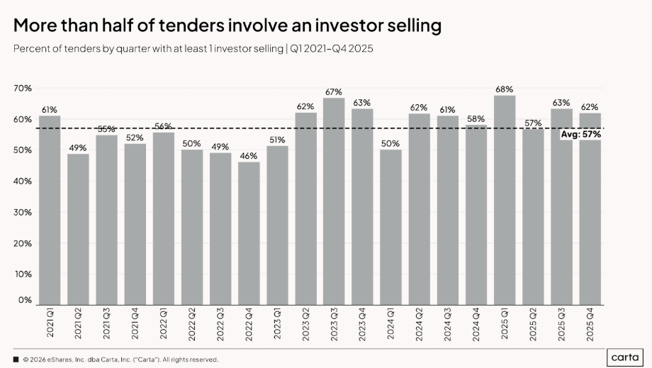Yet, this isn’t just an employee story: More than half of all tender offers — 57% on average since Q1 2021 — involve at least one investor selling. In the most recent quarters, that figure has been running above 60% consistently. Investors are using these same windows to realize partial returns, especially as fund timelines stretch and LPs get impatient. A tender offer today can be as much about GP portfolio management as it is about rewarding employees.