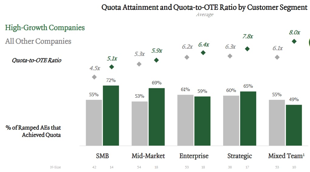 Not only do high-growth companies have higher quota:OTEs, but they generally have higher attainment as well.